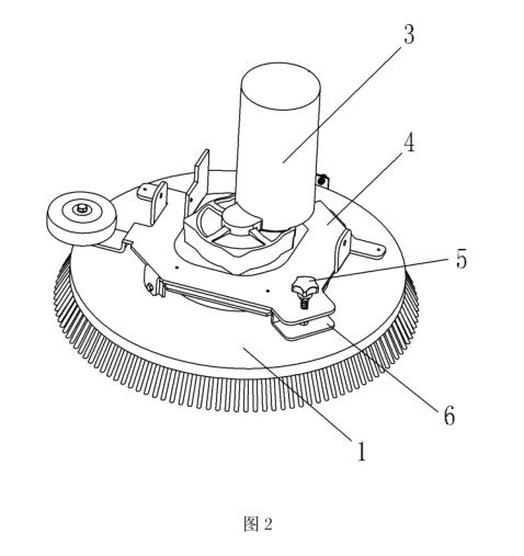有益效果是:本實(shí)用新型在使用過(guò)程中,當(dāng)調(diào)節(jié)螺栓向下運(yùn)動(dòng)吋,電機(jī)固定板受カ繞鉸接軸轉(zhuǎn)動(dòng),產(chǎn)生偏擺,也帶動(dòng)刷盤組件向一側(cè)偏擺,從而増大了刷盤毛單側(cè)對(duì)地面的壓力,進(jìn)而在刷盤旋轉(zhuǎn)過(guò)程中形成了一定的牽引力,使刷盤轉(zhuǎn)動(dòng)更加輕松,減輕了操作者的疲勞強(qiáng)度;同時(shí),可根據(jù)地面條件的不同,對(duì)調(diào)節(jié)螺栓的旋入程度進(jìn)行調(diào)整,即調(diào)整對(duì)電機(jī)固定板的壓カ大小,從而改變刷盤毛單側(cè)對(duì)地面的壓力,以實(shí)現(xiàn)不同地面條件下?tīng)恳Υ笮〉倪m度調(diào)整。